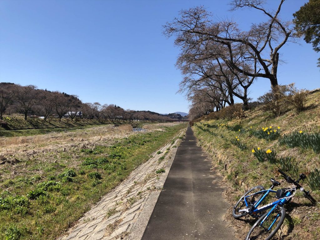 さて、4月16日。郡山市内の桜は満開を迎え、小野町の「夏井の千本桜」の開花状況を調べるついでに、念願であった夏井川のダウンサイクリングをすることになりました。夏井川は田村市からいわき市を通り太平洋へと流れる川です。磐越東線と夏井川、車道が並走し、写真ポイントもたくさんあるのですが、道が狭く駐車しにくいため、一度は自転車で通ってみたと思っていました。次回は紅葉の時期に行ってみたいと思います。